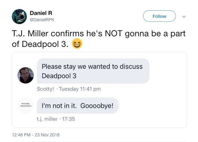 In a Twitter exchange (via DanielRPK), Miller ended the conversation by definitively stating he's not in Deadpool 3. Check out the post in the space below: